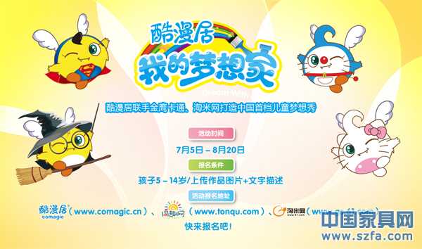 暑假對每個孩子的意義等同于兩個月的悠長假期,每到這時家長們都在想給孩子一個怎樣的假期才有意義呢?2012年暑假,國際動漫兒童家居第一品牌廣州酷漫居動漫科技有限公司聯(lián)手金鷹卡通王牌節(jié)目《玩名堂》,打造中國首檔兒童互助體驗夢想秀節(jié)目“我的夢想家”,現(xiàn)在正式全國招募。從夢想和愛出發(fā),為孩子打造一個全新的暑假計劃。
