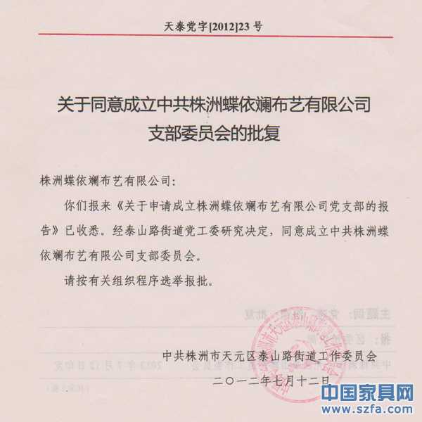 經(jīng)中共株洲市天元區(qū)泰山辦黨工委批準(zhǔn),2012年7月,株洲蝶依斕布藝有限公司黨支部正式成立。羅丹任蝶依斕黨支部第一任書記。