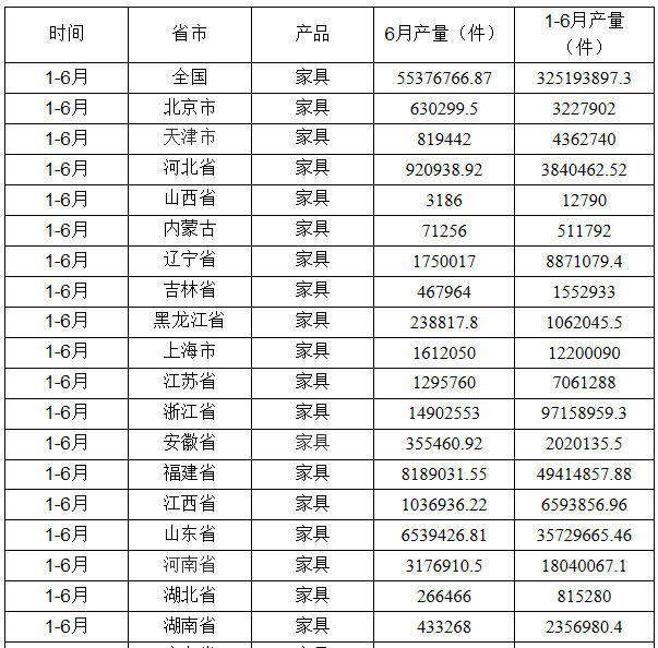 核心提示:2012年1-6月中國家具分省市產量數據統(tǒng)計: