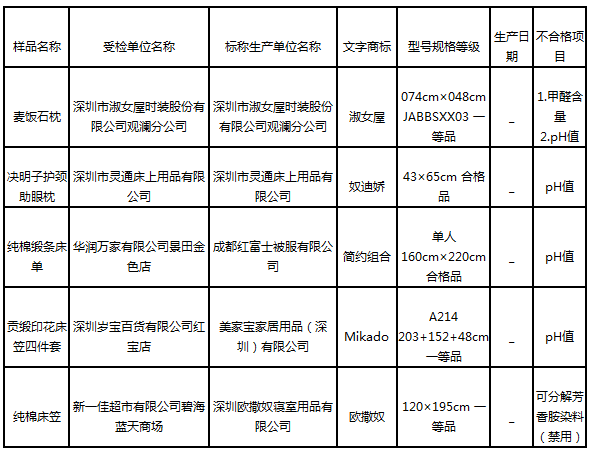 本次抽查中,pH值項目不合格的產(chǎn)品,還涉及標(biāo)稱深圳市靈通床上用品有限公司生產(chǎn)的43×65cm 合格品“奴迪嬌” 決明子護(hù)頸助眼枕、標(biāo)稱成都紅富士被服有限公司生產(chǎn)的單人 160cm×220cm 合格品“簡約組合” 純棉緞條床單、標(biāo)稱美家寶家居用品(深圳)有限公司生產(chǎn)的A214 203+152+48cm 一等品“Mikado” 貢緞印花床笠四件套。