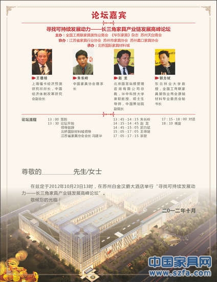 2012年10月23日,由全國工商聯(lián)家具裝飾業(yè)商會、《華東家具》雜志、蘇州天臺商會主辦,江蘇省家具行業(yè)協(xié)會、蘇州市家具協(xié)會、蠡口家具協(xié)會協(xié)辦,北橋國際家具材料城承辦的“尋找可持續(xù)發(fā)展動力——長三角家具產業(yè)鏈發(fā)展高峰論壇”將在蘇州白金漢爵大酒店盛大舉行。此次論壇旨在探討長三角地區(qū)家具行業(yè)整個產業(yè)鏈的可持續(xù)發(fā)展問題。