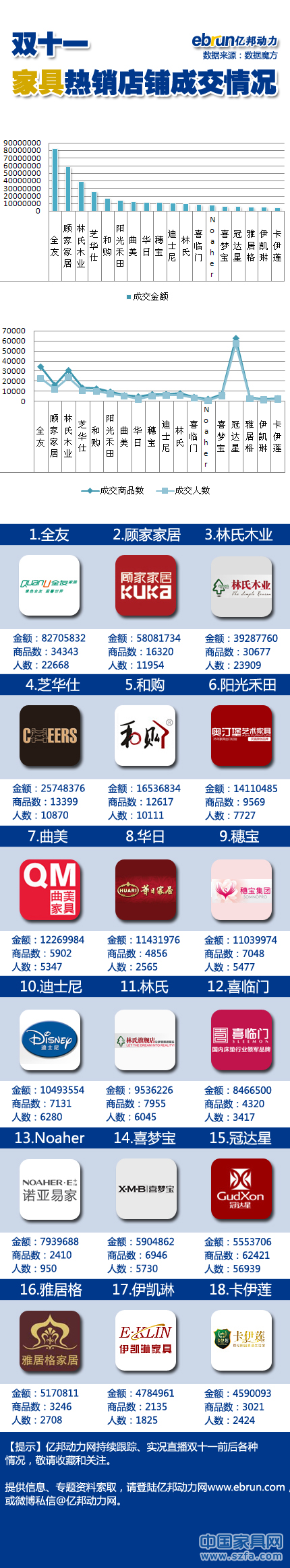 11月17日消息,億邦動力網(wǎng)獲悉,在今年天貓雙十一大促中,全友、顧家家居、林氏木業(yè)、芝華仕、和購、陽光禾田、曲美、華日、穗寶、迪士尼分別進(jìn)入銷售額前十排行。
