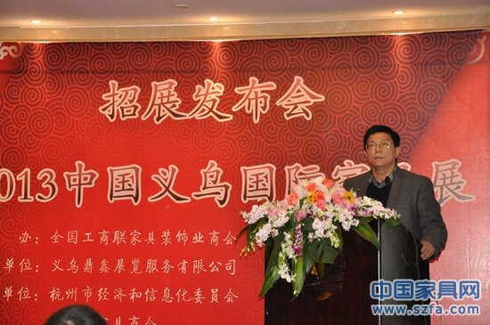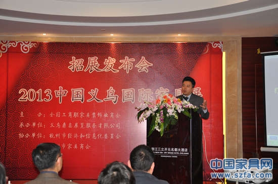 2012年12月7日,首屆中國義烏國際家具展在杭州三立開元大酒店舉辦招展發(fā)布會(huì)。據(jù)悉,義烏國際家具展覽會(huì)將于2013年4月舉辦。本次杭州招展發(fā)布會(huì)上,義烏市有關(guān)部門領(lǐng)導(dǎo)和展會(huì)組委會(huì),浙江省家具行業(yè)協(xié)會(huì)理事長蔣鴻源,義烏市委常委,義烏市副市長陳勇,杭州市經(jīng)信委副處長金煉,全國工商聯(lián)家具裝飾業(yè)商會(huì)副秘書長郭力兵,杭州市家具商會(huì)名譽(yù)會(huì)長陳貴榮,杭州市家具商會(huì)執(zhí)行會(huì)長趙玉林,杭州市家具商會(huì)秘書長楊幼明等領(lǐng)導(dǎo)出席會(huì)議。