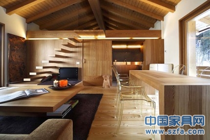 你即將進入一個全部由木材建造的地方,從地板、天花板甚至是家具,所有的一切都為木質(zhì),這種獨特的細節(jié)將這個公寓裝點得無比迷人、溫馨,讓人眼前一亮。這是一棟能讓你聯(lián)想到滑雪度假村的公寓。