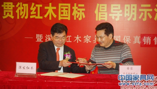 會(huì)議首先進(jìn)行簽約環(huán)節(jié)。深發(fā)紅木董事長張祝林、中國林科院木材工業(yè)研究所所長助理、中國林產(chǎn)工業(yè)協(xié)會(huì)紅木分會(huì)常務(wù)理事長呂斌研究員、中國家具協(xié)會(huì)傳統(tǒng)家具委員會(huì)秘書長姜恒夫等分別就深發(fā)紅木簽約保真銷售進(jìn)行了熱情洋溢的致詞,之后再各方人士的見證下,深發(fā)紅木董事長張祝林與國家家具及室內(nèi)環(huán)境質(zhì)量監(jiān)督檢驗(yàn)中心主任羅炘共同簽署了“深發(fā)紅木家具全國保真銷售協(xié)議”。