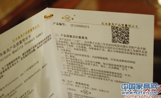 在消費(fèi)者如何區(qū)分紅木家具的“全”與“不全”等問題上行業(yè)專家也給出了詳盡的答案。而對于在購買合同上能否直接標(biāo)稱“全紅木家具”的問題,中國林產(chǎn)工業(yè)協(xié)會(huì)紅木分會(huì)秘書長殷亞方研究院也給出了“這樣標(biāo)注并不合理”的解釋。 產(chǎn)品質(zhì)量明示卡 產(chǎn)品質(zhì)量明示卡