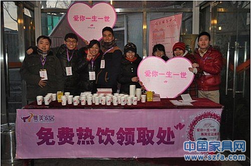 今天清晨天氣比較寒冷,記者穿著厚厚的羽絨服依然覺得寒意逼人。來到服務(wù)點(diǎn)看到,集美家居的工作人員正在為排隊(duì)的新人斟上一杯杯熱氣騰騰的咖啡奶茶,在寒夜中彌漫一陣甜蜜的香氣。