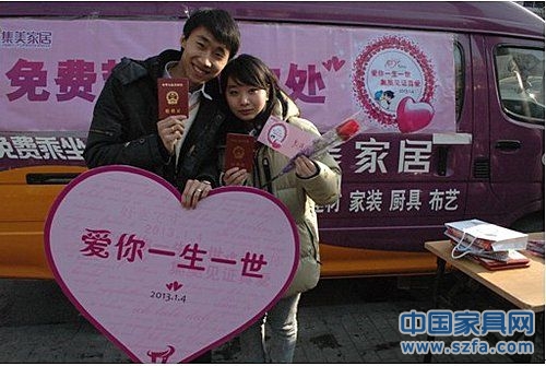 選擇在2013年1月4日這一天登記結(jié)婚的情侶們是非常幸運(yùn)的,在享受了貼心服務(wù)之后,還可以在情人節(jié)的時(shí)候領(lǐng)取到由集美家居提供的價(jià)值5000元的家具建材置家券和價(jià)值1000元的家居禮包卡。其他朋友們也不用太羨慕,除了這一天登記的情侶們,集美家居還有更大的驚喜要送給全北京的有情人:1月4日到2月14日之間,關(guān)注集美家居官方新浪微博,上傳情侶合影,就有機(jī)會(huì)贏得包括價(jià)值5000元的奢華(奢華裝修效果圖)鉆戒在內(nèi)的多種好禮,以及100個(gè)高級(jí)定制的情侶馬克杯全城放送。