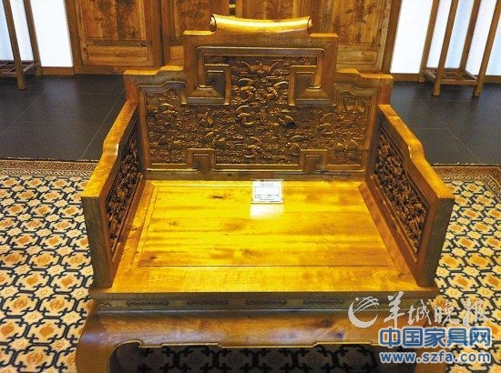 和其他店家相比,該店單門獨(dú)戶占地頗大,整個(gè)外墻都是紅黃一片,“貴族藝術(shù)”、“中國皇帝御用”等大字招牌格外醒目。一位自稱姓張的女店員接待了記者,記者指著一張羅漢床問:“這張床就是電視里的億元羅漢床?”張小姐說:“這張床是70萬元,另外一張是150萬元。億元羅漢床在另外一家店里。那個(gè)料好,很老很老的。金絲楠木越老金絲就越多。你要是喜歡,也可以跟老總談。”