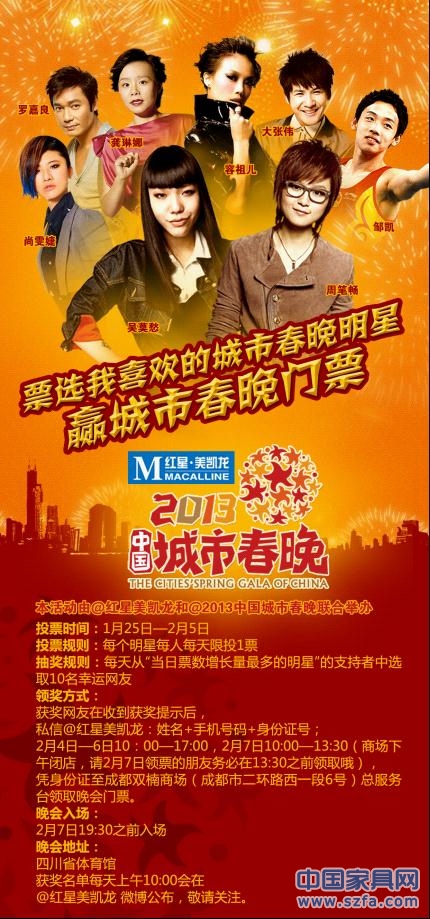 曾幾何時(shí),當(dāng)港臺(tái)明星開始登上春晚舞臺(tái),明星開始成為春晚節(jié)目單上必不可少的一道風(fēng)景,娛樂性也隨之成為了評(píng)判春晚質(zhì)量的一把標(biāo)尺。伴隨著春節(jié)佳節(jié)的臨近,由紅星美凱龍全程冠名的“幸福城市•美麗中國(guó)”2013中國(guó)城市春節(jié)聯(lián)歡晚會(huì),將于2013年2月7日20時(shí)于四川省體育館隆重開場(chǎng),秉承“以家為本”的品牌理念,紅星美凱龍希望能在新春佳節(jié)即將到來之際,為中國(guó)萬(wàn)千家庭獻(xiàn)上一段與家人團(tuán)聚的美好時(shí)光。