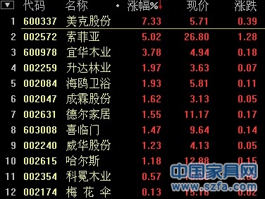 家居用品板塊午后走強(qiáng),居于漲幅榜前位,個股多數(shù)上漲。截至發(fā)稿前,板塊整體上漲1.94%,美克股份大漲7.33%,索菲亞上漲5.02%,宜華木業(yè)上漲3.78%。