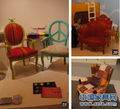 展會上傳統(tǒng)家具及元素出現(xiàn)得比較少,偶爾出現(xiàn)的作為點(diǎn)綴的傳統(tǒng)家具,設(shè)計手法都比較巧妙,極具后現(xiàn)代的手法,如圖20、21、22、23。在色彩、材質(zhì)、紋理、功能的某一方面進(jìn)行大膽創(chuàng)新。有的甚至采用戲謔方式來表達(dá)傳統(tǒng)家具,如圖23所示,將海盜的骷髏頭運(yùn)用于家具之上。