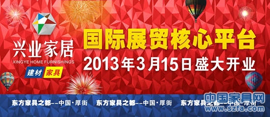 為貫徹落實(shí)黨的十八大關(guān)于扎實(shí)推進(jìn)社會主義文化強(qiáng)國建設(shè)的重要部署,深入推動?xùn)|莞打造文化名城建設(shè),提升厚街文化軟實(shí)力,結(jié)合厚街打造“現(xiàn)代文化名鎮(zhèn)”的目標(biāo),推動城市文化與經(jīng)濟(jì)社會相互協(xié)調(diào)發(fā)展,3月15—22日,以文化推動家居產(chǎn)業(yè)升級發(fā)展為背景的“‘興業(yè)鼓舞’2013厚街首屆家居文化節(jié)”在興業(yè)家居賣場隆重舉辦。3月15日,秉承“新商業(yè)·新生活”之理念,為全球展貿(mào)營銷模式創(chuàng)造更高品牌商業(yè)價值的中國首座家居主題購物公園休閑體驗(yàn)中心——興業(yè)家居盛大開業(yè)!