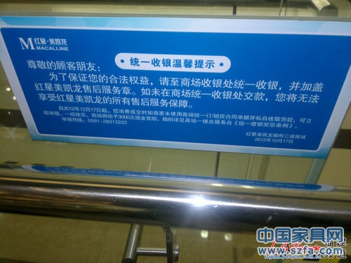 “如果沒(méi)有統(tǒng)一收銀,萬(wàn)一遇到商品質(zhì)量問(wèn)題找誰(shuí)負(fù)責(zé)?”日前,在紅星美凱龍福州三迪商場(chǎng)購(gòu)物的陳先生爆料,他介紹說(shuō),紅星美凱龍商場(chǎng)內(nèi)隨處張貼著禁止商家私自收取貨款的通知,但在購(gòu)物時(shí),商家卻又建議在店內(nèi)直接完成交易,“紅星美凱龍商場(chǎng)如此管理方式,他們承諾的售后服務(wù)能否兌現(xiàn)?”陳先生心感擔(dān)憂,一直對(duì)看中的家具不敢購(gòu)買。