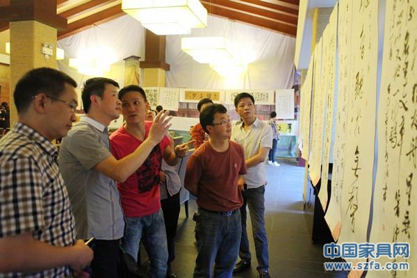 圖為義賣會(huì)上,一些書法愛好者欣賞作品