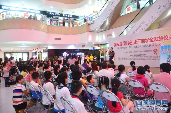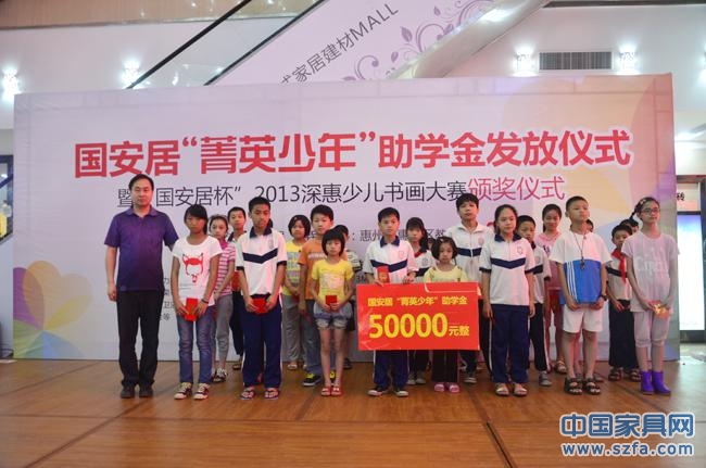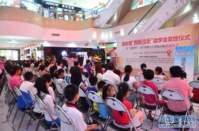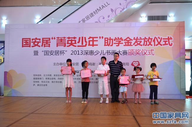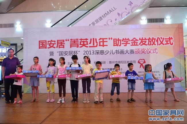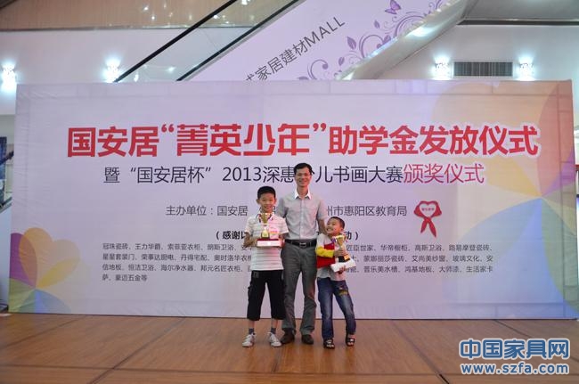 當天除了舉行助學儀式之外,惠陽國安居還舉行了2013國安居“深惠少兒書畫”比賽的頒獎儀式,儀式上頒發(fā)了金銀銅紀念獎總共50名,分別都獲得了由國安居提供的ipad2、獎杯、電子相框、精美學習用品、獲獎證書等獎品。據(jù)國安居副總鄧劍峰介紹,本次的惠陽國安居少兒書畫大賽是國安居舉辦以來人數(shù)最多,遍布最廣,評選獲獎名額最多的一次。
