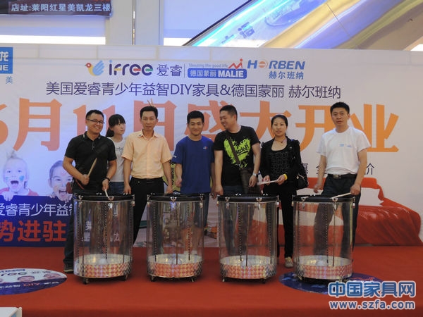 2013年6月11日,美國(guó)愛睿DIY家具分店開業(yè)儀式在山東萊陽紅星美凱龍全球家居生活廣場(chǎng)隆重舉行,總經(jīng)理廖志閣親臨開業(yè)現(xiàn)場(chǎng),社會(huì)各界友人、廣場(chǎng)負(fù)責(zé)人、新聞媒體應(yīng)邀陸續(xù)出席,或送來賀詞花籃與愛睿同仁共同慶祝在萊陽分店的開業(yè)。