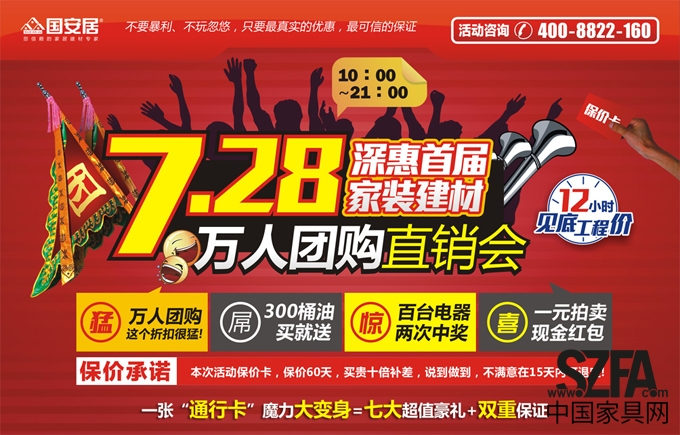 國(guó)安居家居建材連鎖商場(chǎng)副總經(jīng)理鄧劍峰說(shuō):國(guó)安居發(fā)展至今十年一直堅(jiān)持“以人為本,誠(chéng)信經(jīng)營(yíng),”的理念,為再次體現(xiàn)和強(qiáng)調(diào)我們這一理念,本次活動(dòng)當(dāng)天惠陽(yáng)國(guó)安居一樓大廳將特別設(shè)置價(jià)格服務(wù)舉報(bào)臺(tái),對(duì)于此次活動(dòng)我們鄭重承諾:保價(jià)60天,買貴十倍補(bǔ)差,15天內(nèi)不滿意可退訂!毋庸置疑,惠陽(yáng)國(guó)安居7月28日萬(wàn)人團(tuán)購(gòu)會(huì)上近百款千元品牌建材1元起拍,百余款正品建材產(chǎn)品2折起搶購(gòu),讓所有業(yè)主放心購(gòu)買,將省錢進(jìn)行到底,另外享受強(qiáng)有力的售后服務(wù)保障。國(guó)安居航天國(guó)企,值得信賴的家居建材專家。