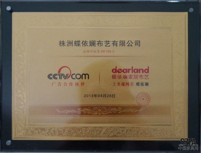 近日,從央視網(wǎng)傳來喜訊,蝶依斕經(jīng)過央視網(wǎng)企業(yè)頻道的層層審核和篩選,最終被授權(quán)為CCTV.COM央視網(wǎng)廣告合作伙伴,合作期為三年。在合作期內(nèi),央視網(wǎng)授權(quán)蝶依斕使用央視網(wǎng)·企業(yè)頻道相關(guān)標(biāo)識(shí),并成為國(guó)內(nèi)布藝行業(yè)首家可將“CCTV”標(biāo)識(shí)與“蝶依斕”LOGO并列使用的企業(yè),并可用于企業(yè)名片、網(wǎng)站、產(chǎn)品宣傳冊(cè)等數(shù)十個(gè)地方,同時(shí)在央視網(wǎng)官方網(wǎng)站,搜索蝶依斕通欄廣告位展示三年。借助央視網(wǎng)品牌影響力,蝶依斕品牌提升再上新臺(tái)階。