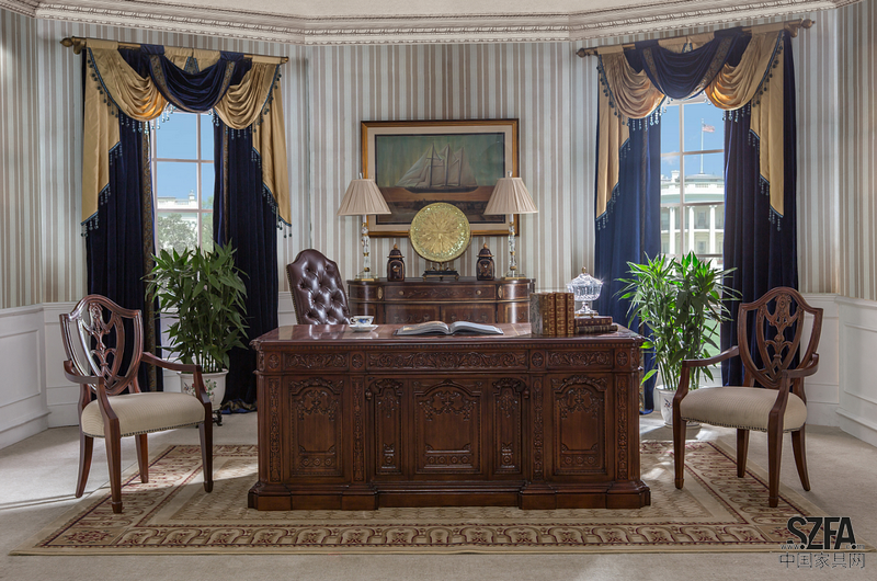 據(jù)介紹,此款新品以奧巴馬橢圓形辦公室的辦公桌——“堅毅桌”為原型。“堅毅桌”是用英國軍艦的船身木材打造的,于1880年由英國維多利亞女王贈送給當(dāng)時的美國總統(tǒng)拉瑟福德·海斯,后由約翰·肯尼迪放入白宮橢圓形辦公室,吉米·卡特、羅納德·里根、比爾·克林頓和喬治·布什等幾位美國總統(tǒng)都用過。福溢家居的設(shè)計師以之為原型,采用豐富細膩的雕刻,厚實氣派的造型,還有端莊優(yōu)雅的涂裝色調(diào),力求為現(xiàn)代都市精英營造一抹鬧中取靜的心靈空間。