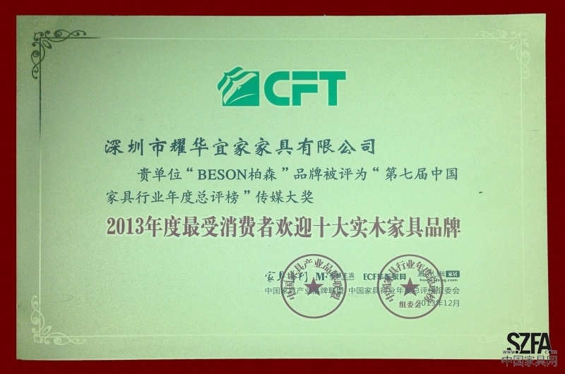 柏森家具在2013年度優(yōu)秀的表現(xiàn)和對(duì)中國(guó)家具的杰出貢獻(xiàn),榮獲了“2013年度最受消費(fèi)者歡迎十大家具品牌”、“2013中國(guó)家具行業(yè)年度最佳原創(chuàng)品牌”、公司董事兼執(zhí)行總裁陳安南榮獲“2013中國(guó)家具行業(yè)年度十大企業(yè)家”稱號(hào),品牌總監(jiān)張運(yùn)金榮獲“2013中國(guó)家具行業(yè)年度杰出職業(yè)經(jīng)理人”稱號(hào),斬獲四項(xiàng)大獎(jiǎng),是此次獲獎(jiǎng)最多的企業(yè)之一。