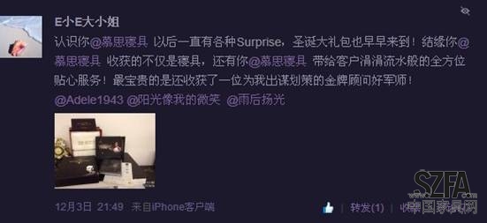 微博大V“豈有慈理”在自己的微博上說的:“光憑每年所有節(jié)日都會無間斷給老客戶送禮品的這份執(zhí)著,我相信你們一定會做得更好!我繼續(xù)支持你們的!”