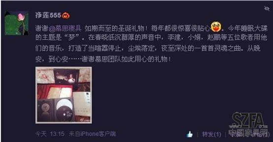 小編發(fā)現(xiàn),網(wǎng)友們所曬的睡眠音樂碟是一張叫做《夢》的黑膠碟片,隨著這張黑膠唱片出現(xiàn)的還有一本叫做《深睡眠》的書籍等物品。深入調(diào)查之后小編發(fā)現(xiàn),原來這是一家叫做慕思的寢具公司送給老客戶的圣誕禮品,因為這家成立十年的公司已經(jīng)持續(xù)送給客戶禮品超過十年,因此收到禮物的客戶都很感動,紛紛曬出禮品表示感謝!有粉絲發(fā)微信表示:“十年時間,橫跨了整整一個年代,在現(xiàn)在這個浮躁的社會,慕思寢具能堅持十年如一日的感動我,我想對你說:你是我心中最喜愛的品牌,沒有之一。”