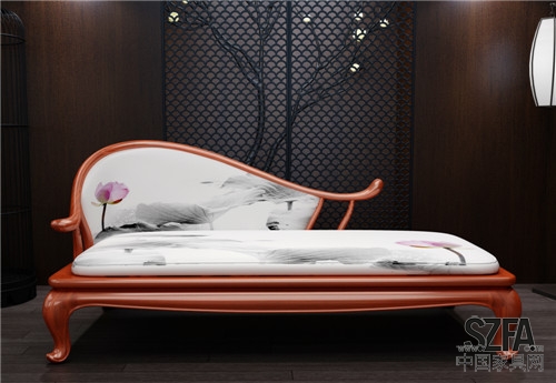 產(chǎn)品為現(xiàn)代中式風(fēng)格,材質(zhì)為緬甸花梨加水墨印花棉麻布。設(shè)計(jì)手法上在傳統(tǒng)明清家具的經(jīng)典形制上加入了一些現(xiàn)代元素,把圈椅舒適線條流暢的特征與羅漢床結(jié)合并配以水墨印花軟包,使之更加符合當(dāng)下人們時尚、簡約、舒適、的生活方式。