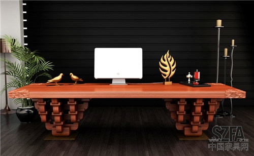 產(chǎn)品為現(xiàn)代中式風(fēng)格,材質(zhì)為緬甸花梨。設(shè)計(jì)手法上在繼承的基礎(chǔ)上發(fā)揚(yáng),桌面由特殊工藝的整板完成,桌角配以祥云點(diǎn)綴,營造出強(qiáng)烈的虛實(shí)張力,最為寫意的是書桌采用兩個斗拱作為支持,斗拱作為中國古典建筑中最華美的裝飾元素,充分表達(dá)了中國傳統(tǒng)美學(xué)典雅、深邃的精神氣質(zhì)。產(chǎn)品夸張卻又恰到好處,在“形”、“材”、“藝”、“韻”四個方面達(dá)到完美統(tǒng)一。