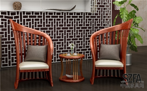 產(chǎn)品為現(xiàn)代中式風(fēng)格,材質(zhì)為緬甸花梨加進(jìn)口小羊皮。設(shè)計(jì)靈感來源于書法的流暢線條和中國的古琴,在中國傳統(tǒng)審美核心“韻律感”中追求靜與動的對立與統(tǒng)一。整套產(chǎn)品猶如空中一對搖曳的音符通透空靈。休閑幾上金屬配件的融入也給傳統(tǒng)中式家具增加了新的審美情趣。