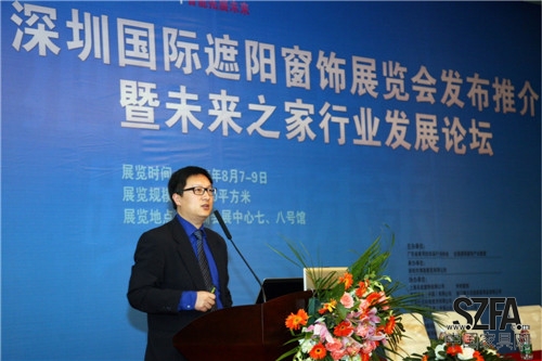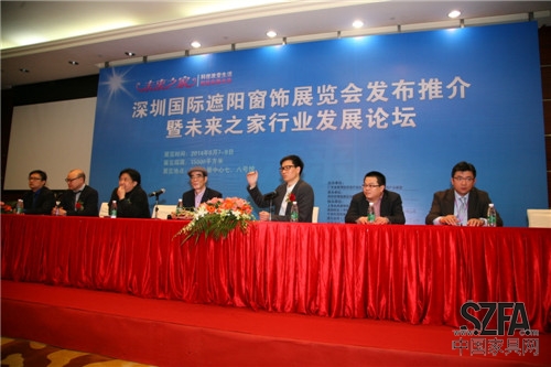2014 年 3 月 8 日,由廣東省家用紡織品行業(yè)協(xié)會、全國遮陽窗飾產業(yè)聯(lián)盟主辦的深圳國際遮陽窗飾展覽會發(fā)布推介暨未來之家行業(yè)發(fā)展論壇在深圳會展中心隆重開幕。 全國工商聯(lián)紡織服裝業(yè)商會副會長、中國家用紡織品行業(yè)協(xié)會副會長、廣東省家用紡織品行業(yè)協(xié)會黃錦權會長,全國工商聯(lián)紡織服裝業(yè)商會布藝分會副會長、廣東省家用紡織品行業(yè)協(xié)會常務副會長蔡榮華、 黃小洪、 李植茂、梁洪輝、劉錦釗, 鄧源津、 陳溢銘、 黎建榮, 全國工商聯(lián)紡織服裝業(yè)商會副會長李巍,上海市裝飾裝修行業(yè)協(xié)會副會長、建筑遮陽專業(yè)委員會主任、 SORARA 晴天花園總經理黃永, 中國建筑節(jié)能協(xié)會常務理事、上海市裝飾裝修行業(yè)協(xié)會副會長、上海名成建筑遮陽節(jié)能技術股份有限公司殷文, 中國建筑節(jié)能協(xié)會常務委員、 英國朗絲集團總裁、浙江朗德實業(yè)有限公司總經理余建明, 寧波杜亞機電技術有限公司總經理鮑永林,法國尚飛中國市場總監(jiān)劉繼武, 德錄峰(上海)節(jié)能設備有限公司總經理李希雷先生,路川金域電子(上海 )有限公司全國銷售經理胡斌,上海名成企業(yè)副總裁殷建生等全國遮陽窗飾產業(yè)聯(lián)盟領導、 企業(yè)代表, 全國軟裝布藝大型零售商代表, 深圳國際家紡展遮陽窗飾參展商,建筑、 酒店工程、 裝飾公司等相關行業(yè)嘉賓共同出席本次盛會, 相互交流、 探討節(jié)能遮陽與家居智能化行業(yè)的發(fā)展模式與未來前景。