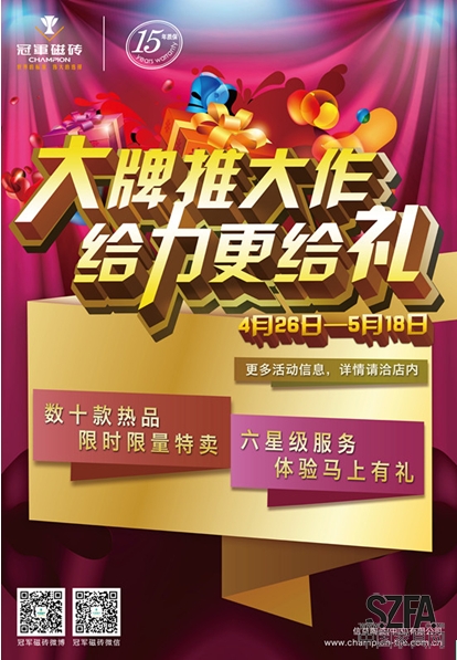 大牌推大作,給力更給禮。冠軍磁磚,給您超值優(yōu)惠、重重驚喜。這個(gè)五一,快來與冠軍磁磚來一個(gè)激情約會(huì)。冠軍將繼續(xù)以世界標(biāo)準(zhǔn)的品質(zhì)和服務(wù),為您呈上偉大的選擇。