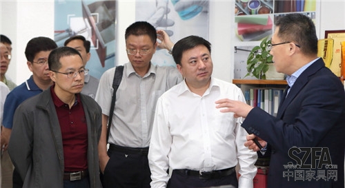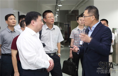 坪山新區(qū)領(lǐng)導(dǎo)劉勝副主任(左)、吳德林主任(中)在侯克鵬會長(右)陪同下考察深家協(xié)家具研發(fā)部