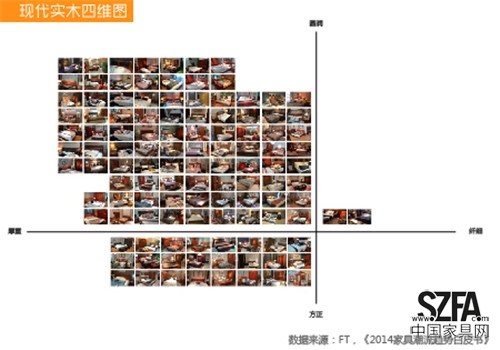 本屆展會實木產(chǎn)品的造型多數(shù)集中在圓潤-厚重區(qū)間內(nèi),整體上表現(xiàn)出高度同質(zhì)化趨勢。未來,單就家具造型本身而言,可以從兩個方向突破產(chǎn)品同質(zhì)化:1、90%的同質(zhì)化+10%的差異化,整體表現(xiàn)出同質(zhì)化,但是細(xì)節(jié)上尋求差異化;2、產(chǎn)品造型向其它維度延伸,這里要注意的是,人群的變量會因此改變,其它變量也要跟著改變。