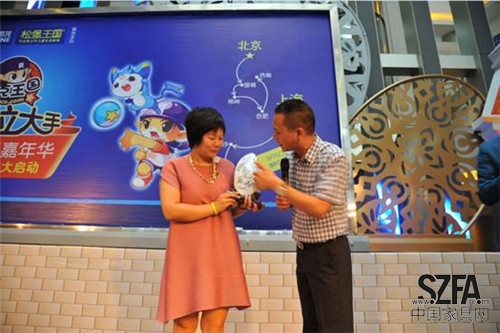 圖為紅星美凱龍家居集團(tuán)招商管理中心總經(jīng)理 胡利杰女士接受郭向陽(yáng)董事長(zhǎng)的贈(zèng)與