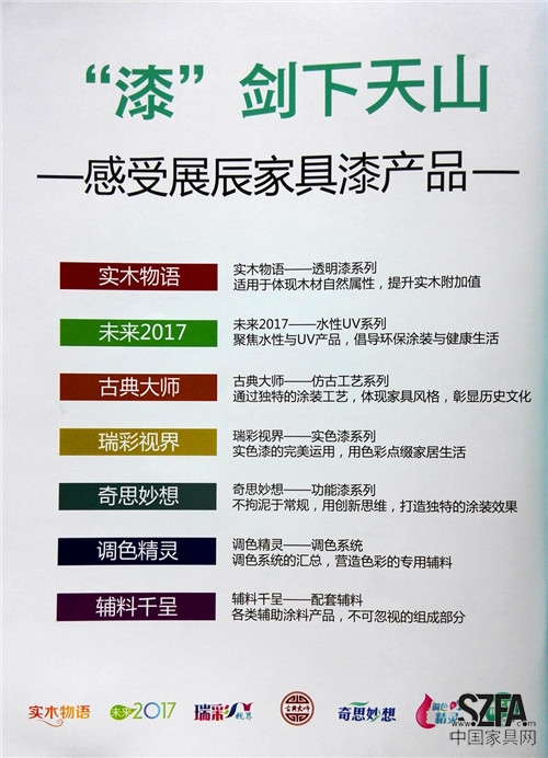 站在用戶的角度審視涂料,2014年展辰涂料面向市場推出“漆劍下天山”產(chǎn)品描述體系,這是一次大膽的嘗試,其目標(biāo)就是讓家具人看懂涂料,完美的詮釋涂料的各種特性。展辰全新的七大系列產(chǎn)品分類,正是從這個(gè)角度實(shí)現(xiàn)了基于客戶需求的產(chǎn)品分類與研發(fā)體系,甚好地將家具人與涂料人緊密地聯(lián)系在了一起。