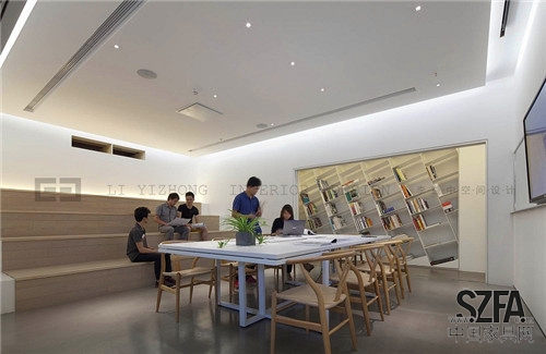 會(huì)議室設(shè)置了幾段大臺(tái)階,可用于內(nèi)部的例會(huì)和設(shè)計(jì)培訓(xùn),80厘米寬的臺(tái)階也可以當(dāng)做床鋪午睡休息。關(guān)于設(shè)計(jì)創(chuàng)意,李益中先生解釋說:“我上一家公司,開會(huì)時(shí)候大家就紛紛忙于搬椅子,搬來(lái)搬去很不方便。所以我在這里借鑒了大學(xué)的階梯教室,來(lái)解決這個(gè)問題。傾斜書架,不僅僅是為了好看——利用重力讓書本自動(dòng)排好,可以節(jié)約管理成本。”