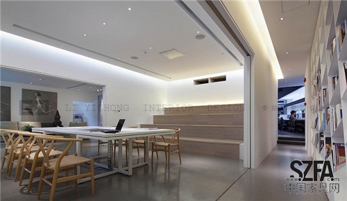 會(huì)議室設(shè)置了兩道手推拉門,開會(huì)的時(shí)候,將兩道門封閉,這里就成為一個(gè)安靜秘密的空間;沒有會(huì)議的時(shí)候,兩道門可以完全打開,會(huì)議室的空間完全融入到休息等候區(qū),乃至延伸到后面的走廊書架,空間就開闊了。