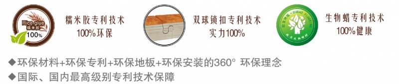 一、更環(huán)保:歐寶糯米膠雙球鎖扣地板,甄選優(yōu)質(zhì)糯米為原料,不添加任何化學(xué)成分,100%確保綠色環(huán)保。地板生產(chǎn)過程中使用糯米膠及生物臘覆膜工藝(生物臘覆膜防水免膠木地板專利號:ZL 03 2 18382.8),糯米膠環(huán)?;慕Y(jié)合四周封臘的效果,地板環(huán)保無懈可擊。不用龍骨、釘子、膠,直接地面鋪裝。免膠鋪裝,接縫嚴(yán)密,不因溫度和濕度變化出現(xiàn)隆起和開裂拔縫等問題。即環(huán)保又省時省力。