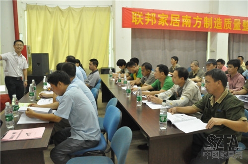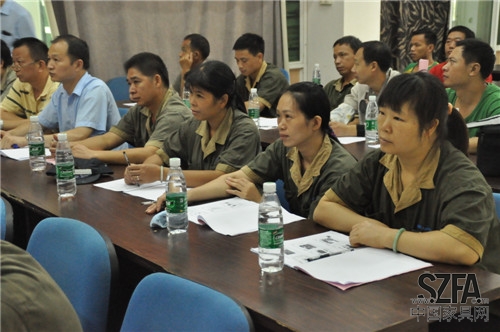 呂德超經理首先根據聯邦家私現有的涂裝實際情況,對家具白身的檢查、處理、素材著色、格麗斯擦涂、干刷、打磨、面修色以及施工過程中異常問題的處理方法,都進行了深入的闡述,并一一解答了學員們提出的疑問。王千鈞副總則對涂裝弊病產生的源頭進行一一講解,分享自己尋找和解決涂裝弊病的經驗和心得。整個交流過程從聯邦家私的實際情況出發(fā),深入淺出,理論和實際有機結合,撥開了涂裝師傅心中的迷霧,受到涂裝師傅的歡迎。