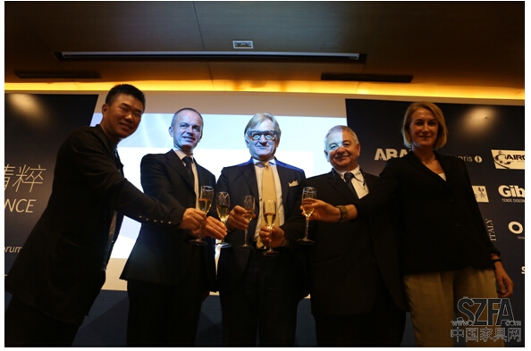 (圖左起分別為設(shè)計(jì)師代表蕭愛彬先生,意大利木業(yè)和家居工業(yè)聯(lián)合會(huì)首席執(zhí)行官龐迪先生,意大利木業(yè)和家具工業(yè)聯(lián)合會(huì)主席施耐德先生,意大利博羅尼亞國際展覽集團(tuán)杜喬先生,意大利對(duì)外貿(mào)易委員會(huì)上海代表處代表Merlino女士)