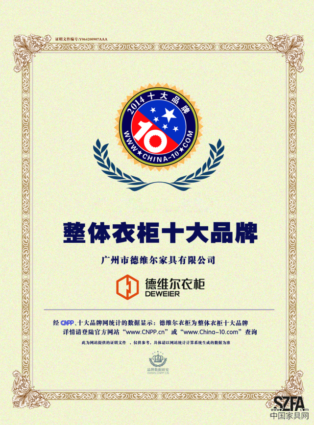 作為中國工商聯(lián)衣柜協(xié)會副會長單位的德維爾,通過ISO9001質(zhì)量管理體系認(rèn)證,曾獲“最有潛力衣柜品牌”、“最佳品牌建設(shè)獎”、“中國環(huán)境標(biāo)志產(chǎn)品認(rèn)證產(chǎn)品”、“廣東省守合同重信用企業(yè)”、“誠信•質(zhì)量標(biāo)桿企業(yè)”、“‘質(zhì)量•服務(wù)'雙十強(qiáng)示范企業(yè)”、“整體衣柜十大品牌”、“中國整體家居聯(lián)盟主席單位”、“中國著名品牌”、“綠色環(huán)保產(chǎn)品”、“3A級服務(wù)單位”等多項(xiàng)榮譽(yù),并多次榮膺“整體衣柜十大品牌”,最近由中國整體衣柜行業(yè)知名網(wǎng)站——中華衣柜網(wǎng)主辦的第三屆“2014中國整體衣柜十大品牌”網(wǎng)絡(luò)評選結(jié)果正式公布,德維爾衣柜赫然在列。