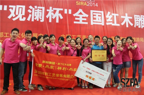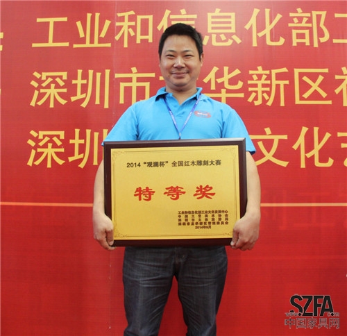 9月19日至20日,2014“觀瀾杯”全國(guó)紅木雕刻大賽于深圳會(huì)展中心隆重舉行,來(lái)自全國(guó)主要紅木產(chǎn)業(yè)集群地的近百名雕刻技師一展不同流派紅木雕刻的絕活。祥利集團(tuán)(旗下紅木家具品牌“友聯(lián)•為家”、“祥利•為家”)雕刻代表團(tuán)王國(guó)華憑借精湛的雕刻技術(shù)從近百名雕刻技師中脫穎而出,奪得本次雕刻大賽最高獎(jiǎng)項(xiàng)——特等獎(jiǎng)。