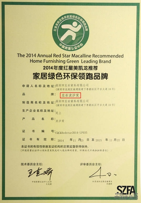 左右皮沙發(fā)榮獲“綠色環(huán)保領跑品牌”