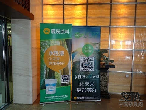 會(huì)議現(xiàn)場(chǎng),展辰涂料精心布置的大量易拉寶形象展示,以及會(huì)前《印象展辰》宣傳片的循環(huán)播放,為宣傳展辰企業(yè)形象和展辰家具漆品牌形象做了充分準(zhǔn)備。會(huì)場(chǎng)中,展辰涂料全水性涂裝色板的展示,更是吸引了眾多與會(huì)代表駐足觀摩,無不對(duì)展辰家具漆精湛的水性涂裝工藝表示贊嘆。