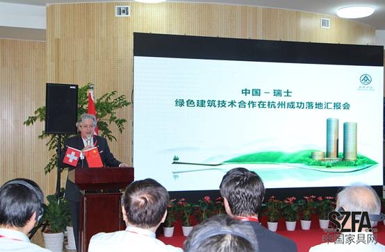 位于杭州高新區(qū)的“亞科中心”(全稱“杭州生物醫(yī)藥科技創(chuàng)業(yè)基地”)工程由瑞士專家主持設(shè)計(jì),中方施工,2013年獲國家三星級(jí)“綠色建筑設(shè)計(jì)標(biāo)識(shí)”,竣工后使用中,全面地體現(xiàn)布魯諾•凱樂先生的“健康、舒適、節(jié)能”的設(shè)計(jì)理念,特別在室外PM2.5達(dá)到200以上時(shí),室內(nèi)能保持在20左右(空氣優(yōu)質(zhì)標(biāo)準(zhǔn))。本次匯報(bào)會(huì),通過杭州亞科的實(shí)例交流活動(dòng),推動(dòng)了中國與瑞士雙方在此領(lǐng)域的國際性交流、學(xué)術(shù)、科研及其他合作,同時(shí)也向社會(huì)大眾人士講述了建筑物綠色技術(shù)與室內(nèi)空氣質(zhì)量營造之間的關(guān)系。