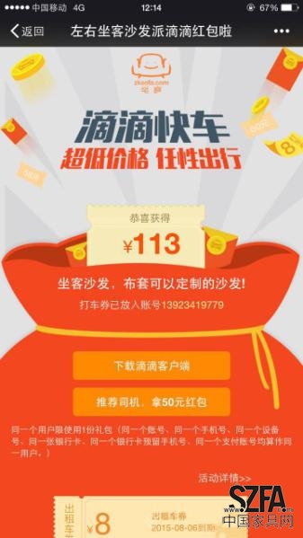 2015年8月27日,左右沙發(fā)旗下左右坐客品牌(www.zksofa.com)攜手全球最大的移動信息出行平臺滴滴打車向廣大互聯(lián)網(wǎng)用戶發(fā)放千萬打車券。用戶只需關(guān)注坐客沙發(fā)公眾號(微信號:zksofa)并回復“1”即可搶到總價值100-150元不等的禮包,內(nèi)含專車券、打車券、快車券、順風車券各種紅包。消費者領(lǐng)取滴滴的各類打車券之后,可以前往坐客沙發(fā)深圳首家線下體驗店,直觀感受快速換套沙發(fā)的魅力。