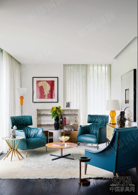 客廳一角的小會客區(qū),適合三五好友小聚,三把沙發(fā)、茶幾和酒柜都來自Poltrona Frau,右側(cè)的邊柜來自Giorgetti。最前方的小煙灰缸架是主人淘來的愛馬仕古董。