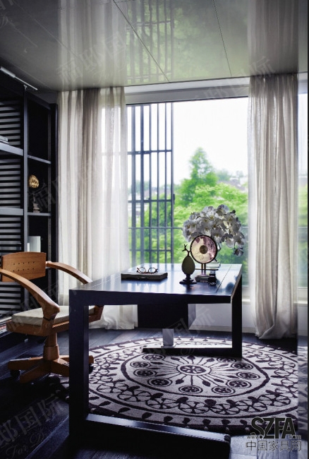 書房里,由Massimo Scolari設(shè)計于1992年的經(jīng)典款Spring轉(zhuǎn)椅是一件“坐著的機(jī)器”,扶手和前腿之間靠機(jī)械連接,讓扶手和靠背有所支撐,使座椅更有彈性。造型別致的書桌和圓形的地毯交相呼應(yīng)。