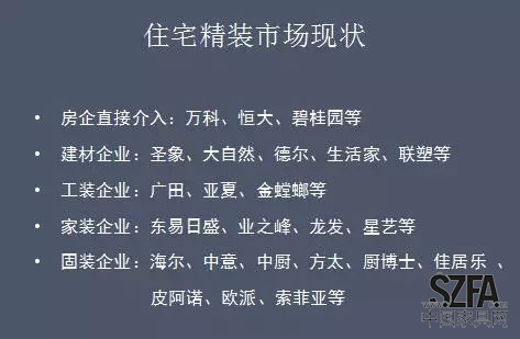 跨界“打劫戰(zhàn)”正在打響。顯而易見,住宅精裝市場已經(jīng)成為了“香餑餑”,大家都想分這杯羹。從第一代的天地墻,如今已經(jīng)發(fā)展成含軟裝的全拎包入住模式。再細看當(dāng)今的住宅精裝配套市場現(xiàn)狀,已經(jīng)有很多企業(yè)以“拎包入住”、“整體家居”的面目出現(xiàn)并快速切入這個市場: